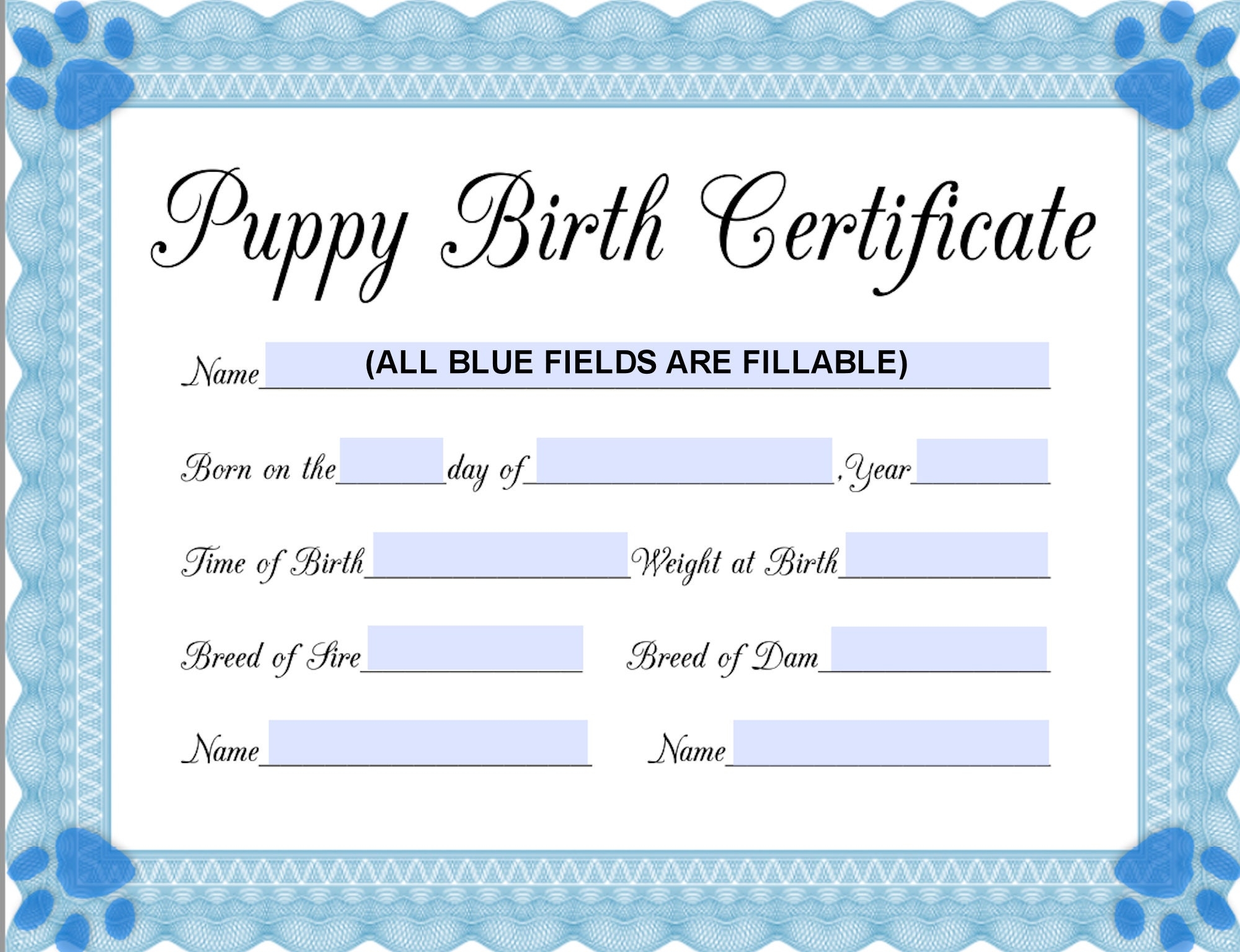 INSTANT Fillable Printable PDF Puppy Birth Certificate blue male Printable 8 5x11 4950px3825px450dpi Jpg BOTH Included Etsy