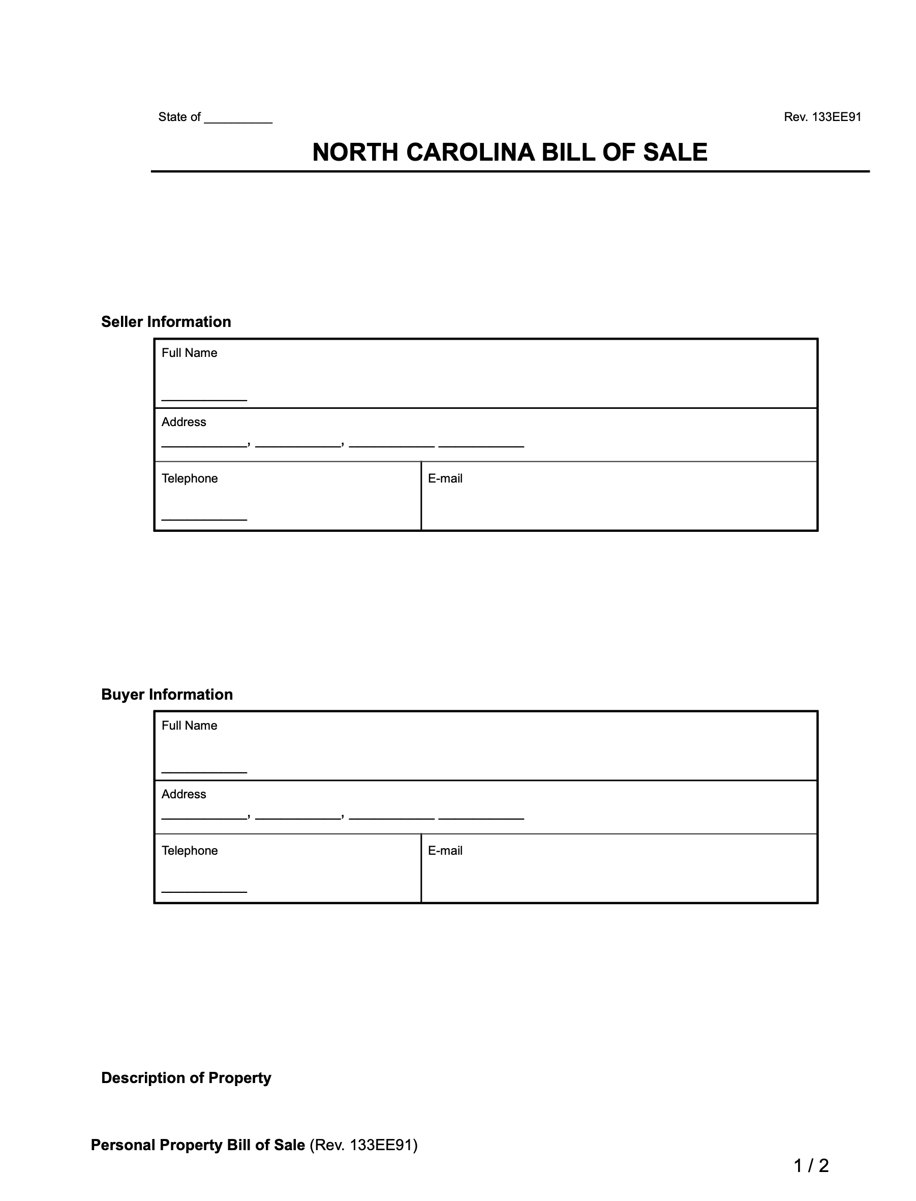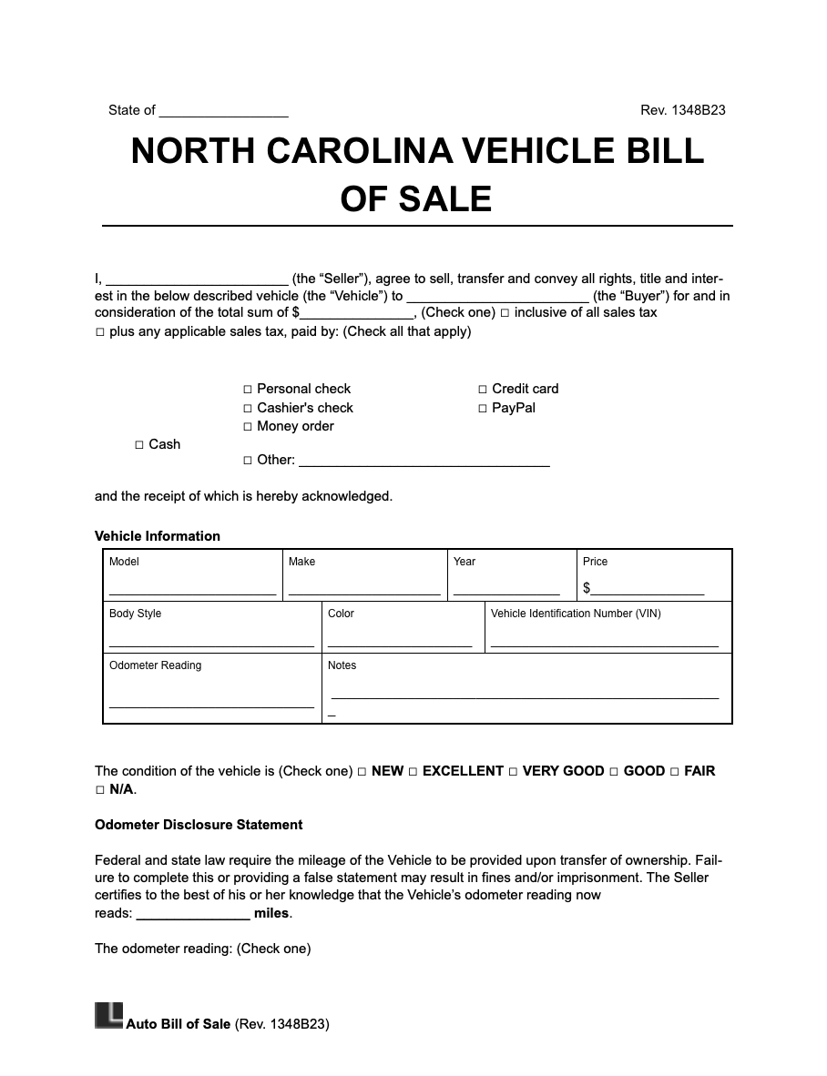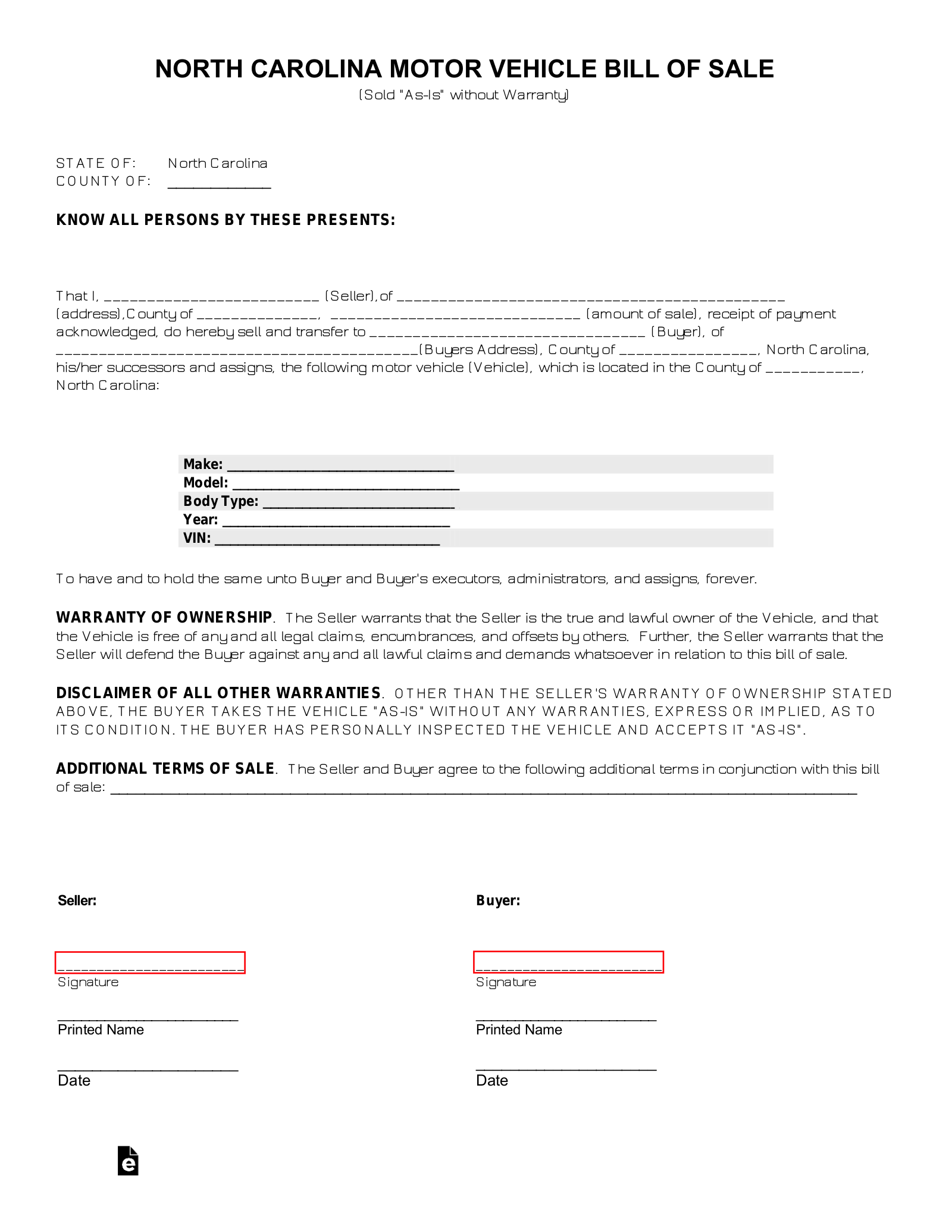 Free North Carolina Motor Vehicle Bill Of Sale Form PDF EForms