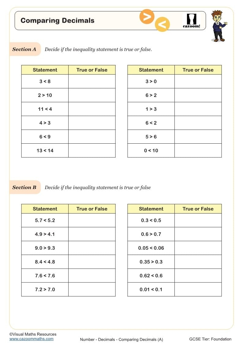 By using visual aids and interactive exercises, these worksheets make it easy for kids to grasp the concept of comparing decimals. Your child will have the opportunity to practice this skill in a fun and engaging way, leading to a deeper understanding of math.