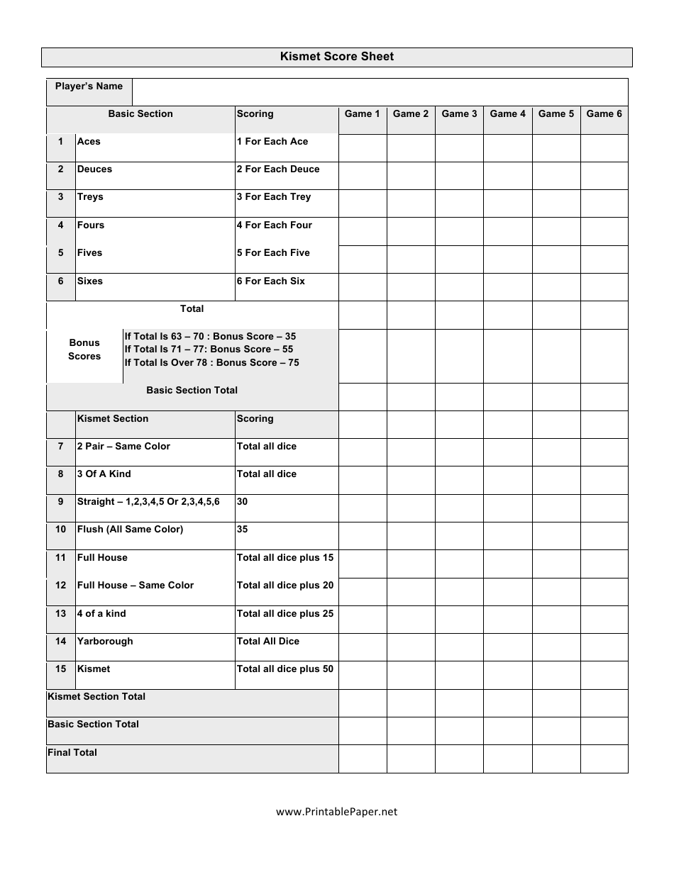 Kismet Dice Game Score Sheet Printable