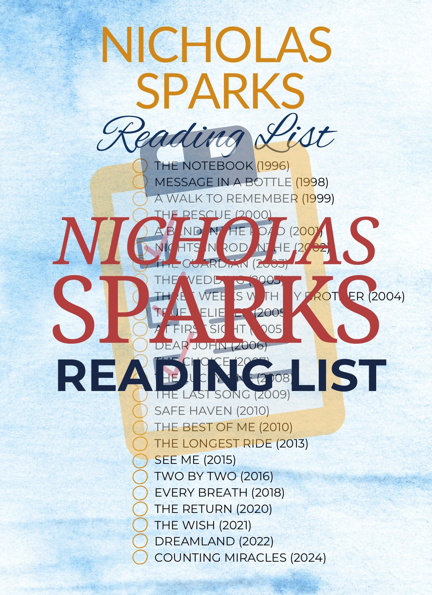 This handy printable allows you to easily check off each book as you read it, ensuring you never miss a title. Whether you’re a seasoned Sparks fan or just starting to explore his writing, this list will help you stay organized and on top of your reading goals.