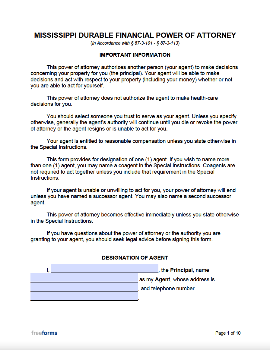 Free Mississippi Power Of Attorney Forms PDF Word