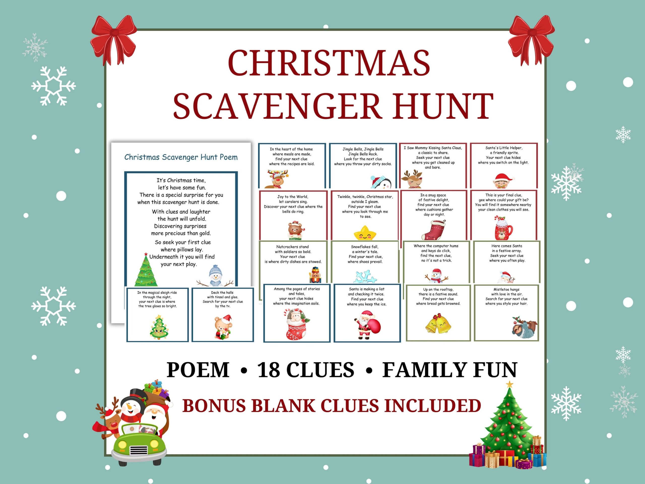 With the help of printable Christmas scavenger hunt poems, you can make this holiday season even more special. So, gather your friends and family, put on your thinking caps, and get ready for a festive adventure like no other. Happy hunting, and merry Christmas!