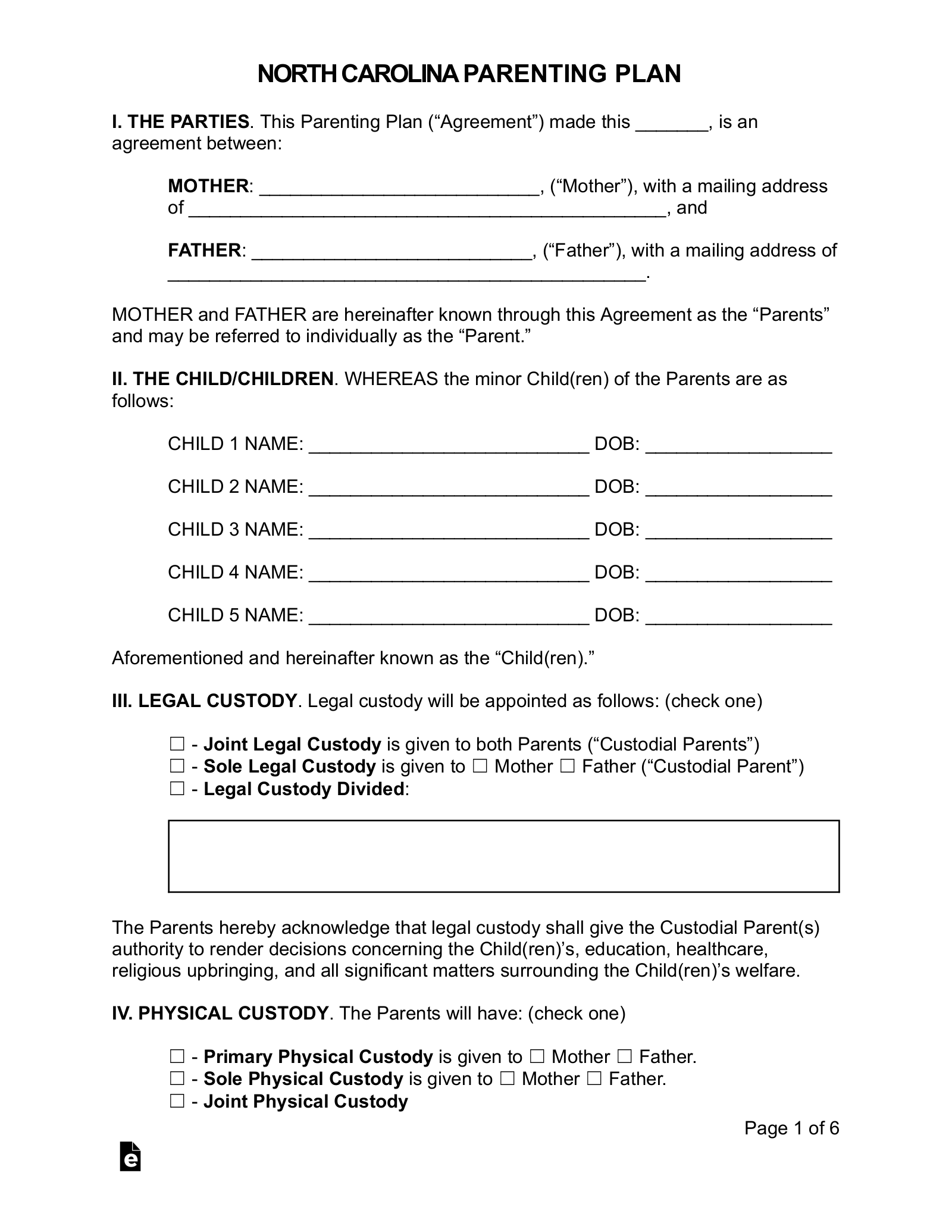 Free North Carolina Custody Parenting Plan PDF Word EForms