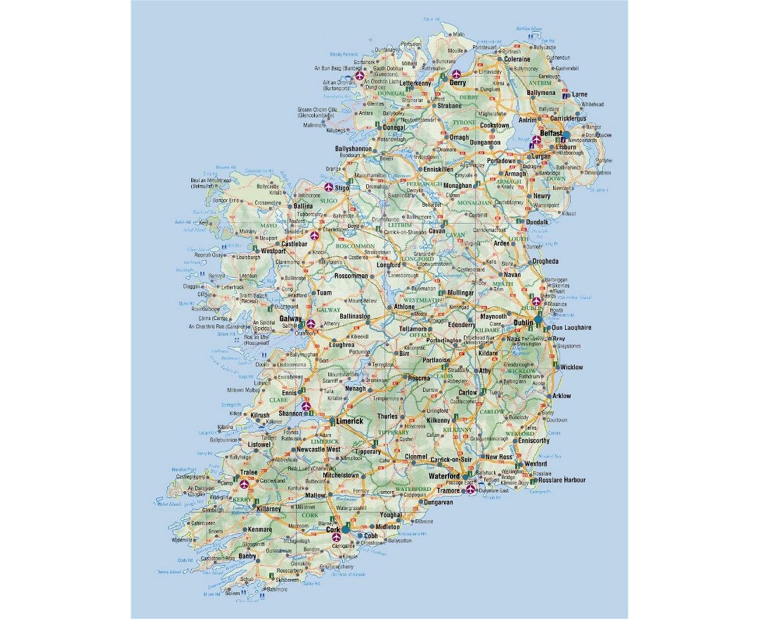 Large Detailed Road Map Of Ireland With Cities Airports And Other Marks Ireland Europe Mapsland Maps Of The World